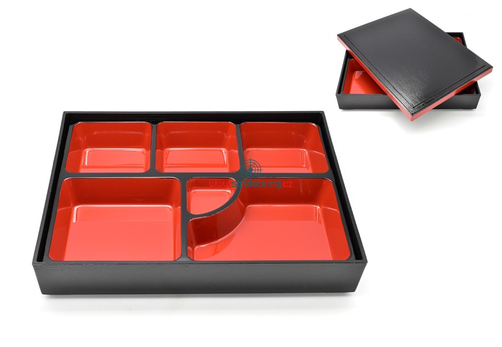 Przedmiotem sprzedaży jest czerwono-czarny bento-box z sześcioma przegródkami, zamykany, wykonany z ABS-Laki.