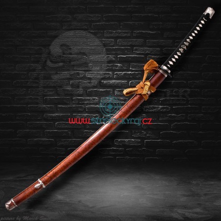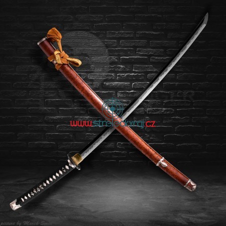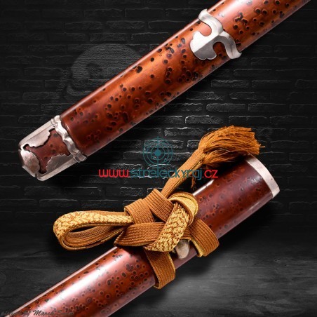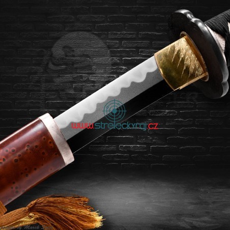 Kovaný japonský meč KATANA (handachi) bez žlábku Bo-Hi. Ostrý (broušený) samurajský meč KATANA (handachi) najde své uplatnění k aktivnímu nácviku bojového umění, ale i jako překrásná dekorace. Výrazný reálný Choji hamon je tvořen dle dávných tradičních metod, které vychází z mnohaletých zkušeností kovářského mistra, který výrobou této nádherné zbraně strávil více než 50 pracovních dnů. Vše na tomto meči je individuálně zhotoveno, včetně saye a habaki, jsou použity nejkvalitnější komponenty, včetně špičkového laku na sayu, japonského hedvábí a skutečné rejnočí kůže nejvyšší kvality. Jedná se o špičkovou repliku samurajského meče, která je vhodná k sekovým zkouškám a lze ji rozložit na jednotlivé části. Tato čepel byla vyzkoušena a testována tak, aby odstranila vše co jí stojí v cestě ! Sori (zakřivení čepele) je speciálně navrženo tak, aby bylo dosaženo co možná nejjemnějších a nejčistších řezů. To vše v kombinaci s výběrem tradičního kovaného Koshirae zaručuje, že získáte to nejlepší z hlediska vzhledu i funkčnosti. Uhlíková ocel Tamahagane má působivou tvrdost HRC 59 - perfektní kombinace této tvrdosti je podtrženo zakřivením čepele Sori, které umožňuje snadné přeseknutí tatami, slaměné rohože, nebo bambusu pro tameshigiri. Full tang konstrukce této katany výrazně zvyšuje sílu meče. Čepel je typu shinogi-zukuri, tento typ čepele se vyrábí od 10.století našeho letopočtu. Hrot meče chu kissaki se skutečným Diamond-Shaped Yokote, které je velmi dobře definováno tím, že hamon prochází po celé délce přes Boshi. Yokote je velmi důležité pro strukturální integritu špičky meče. Pomáhá absorbovat otřes, rozptýlí sílu a přispívá k stabilitě a síle meče při tzv. sekořezu. Tato katana (samurajský meč) je vhodná na použití v praxi, firma Dellinger se však zříká jakékoliv odpovědnosti za zranění a poškození vzniklá při použití. Schraňujte mimo dosah dětí ! Jakákoliv manipulace se samurajským mečem je na vaší vlastní odpovědnost. Nezapomeňte, že máte ve svých rukou smrtící zbraň !