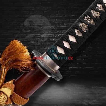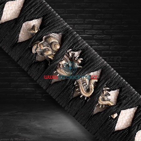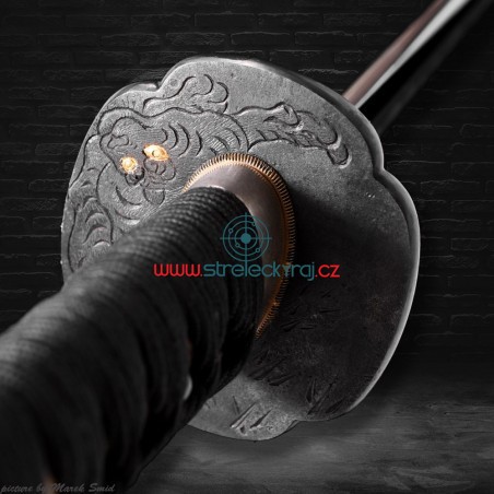 • tsuba: kovaná s orientálním motivem draka - oči vykládané zlatem
