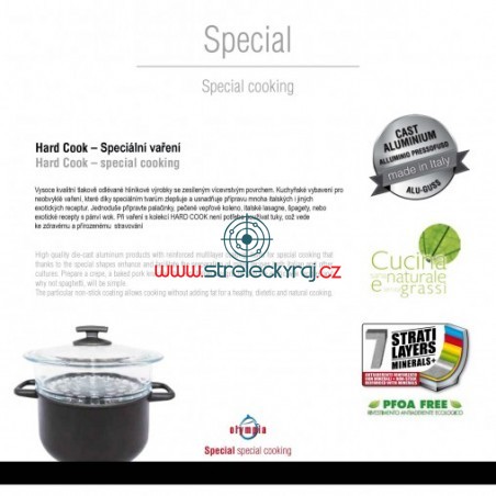 HARD COOK Line - Nádobí běžně nazývané STONE ( kámen ), není pro nás dočasnou módou, ale skutečnou kvalitou! Kolekce pánví, pekáčů a grilovacích pánví vyrobených technologií tlakového lití hliníku. Vysoké hliníkové dno přenáší a udržuje stabilní teplotu i po vyjmutí pánve z plamene; což znamená rovnoměrné vaření a značnou úsporu energie. Vysoká kvalita našeho vícevrstvého nelepivého povrchu zesíleného minerálními částicemi zajišťuje ještě větší nepřilnavost, vysokou odolnost proti otěru a charakteristické vlastnosti podobné vaření na kameni. Při vaření s kolekcí HARD COOK není potřeba používat tuky, což vede ke zdravému a přirozenému stravování. Hrnce a pánve mají rukojeti vyrobené z jednoho kusu odlévaného hliníku, který zajišťuje robustnost a možnost použití přímo v troubě. Při výrobě používáme pouze suroviny certifikované podle evropských předpisů upravujících produkty, které jsou v kontaktu s potravinami. Všechny naše produkty neobsahují látky PFOA, jsou bez niklu, recyklovatelné a šetrné k životnímu prostředí. HARD COOK to jsou pánve a hrnce s dlouhou životností !