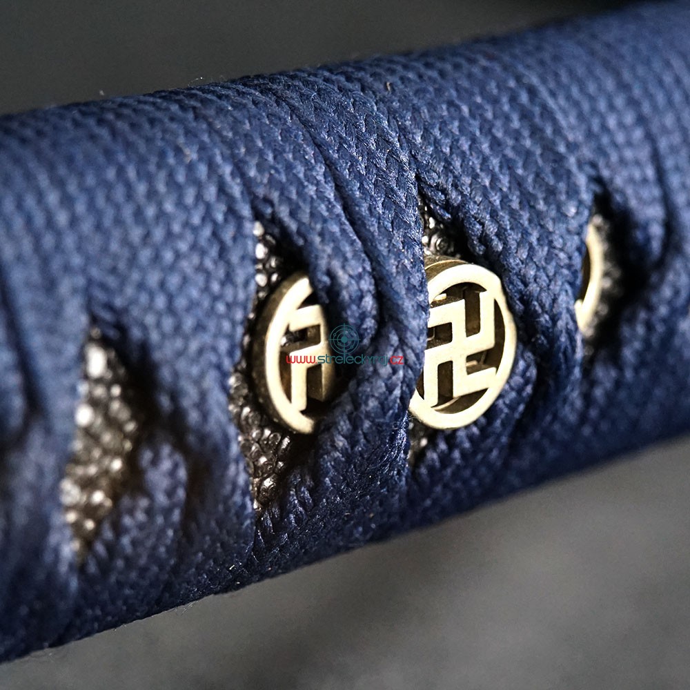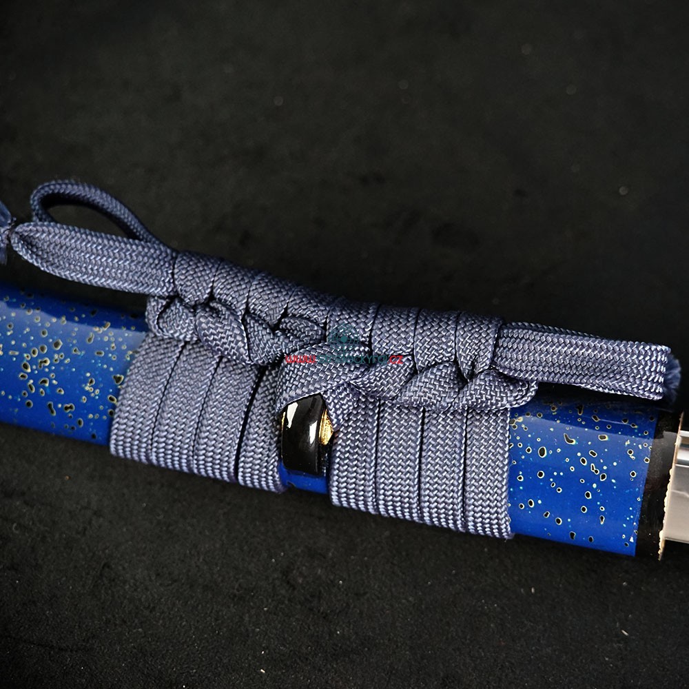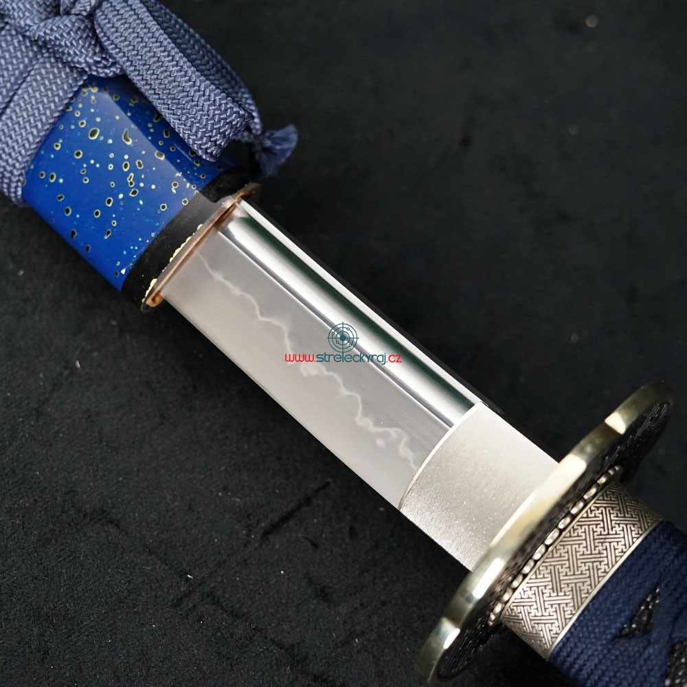 Tato exkluzivní replika katany Aikumo je vyrobena z vysoce uhlíkové nástrojové oceli AISI 1095. Čepel byla parciálně tvrzena tradiční metodou, čímž vznikl unikátní reálný hamon Choji. Pro dosažení optimální ovladatelnosti je čepel vybavena žlábkem Bo-Hi, který snižuje hmotnost a při seku vydává charakteristický zvuk. Saya z tvrdého dřeva v lesklé modré úpravě s jemným dekorem doplňuje elegantní modrostříbrný oplet rukojeti.