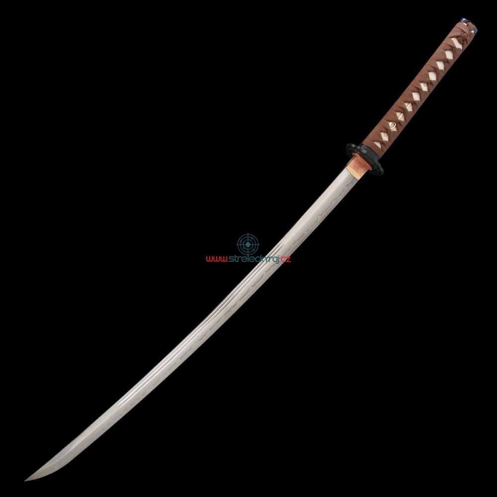 • Celková délka katany - 104 cm• Váha katany včetně sayi - 1290 g• Délka čepele (Nagasa) – 73 cm (včetně Habaki 2.8 cm)• Typ čepele – Shinogi Zukuri• Materiál čepele – L6 Hi-carbon steel, tvrdost ostří (Hasaki) 58HRC• Tloušťka čepele (u Habaki) - 0.75 cm• Výška čepele (u Habaki) - 3.2 cm• Tloušťka čepele (Kissaki) - 0.5 cm• Výška čepele (Kissaki) - 2.3 cm• Délka hrotu (Kissaki) - 3.8 cm• Zakřivení čepele (Sori) - 2.2 cm• Hamon - reálný• Habaki - mosaz (délka 2.8 cm)• Tsuba – vysoce kvalitní uhlíková ocel• Tsuka (rukojeť) - Genuine Ray Skin + Hard Wooden, dřevěné jádro obalené pravou kůží z rejnoka (Samegawa) s hnědou semišovou kůží Ito Wrapped. Čepel katany je zajištěna dvěma mekugi (kolíky). Čepel od rukojeti můžete odmontovat vytažením těchto kolíků. Na každé straně Tsuky je zlatá spona (ornament).• Saya (plášť - obal) – dřevěná, černá, matná, vyrobena z tvrdého dřeva - povrch je lakovaný a lesklý. Vysoce kvalitní hedvábný oplet Sage-O je vázán kolem Kurigaty (knoflíku) pláště.