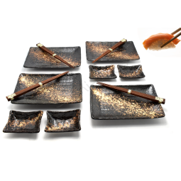 Skład 6-częściowego kompletu dla czterech osób:4 - miseczki na sos 9.5 x 6.5 cm4 - talerze 22 x 12.5 cm4 - pary pałeczek 22.5 cm