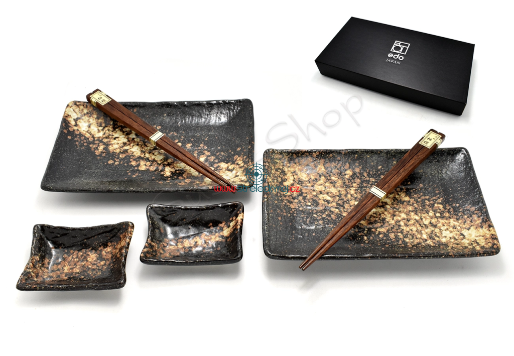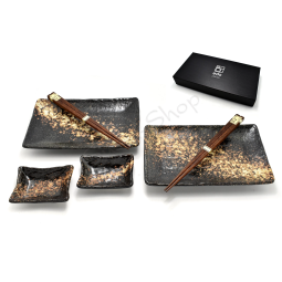 Skład 6-częściowego kompletu dla dwóch osób:2 - miseczki na sos 9.5 x 6.5 cm2 - talerze 22 x 12.5 cm2 - pary pałeczek 22.5 cm