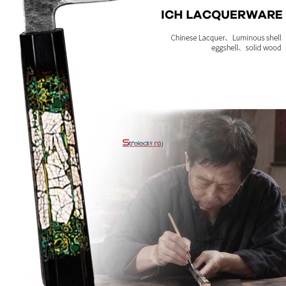 Osmihranná rukojeť je vyrobena z masivního dřeva s tradiční čínskou lakovou úpravou (Chinese lacquer). Povrch je dekorován luminiscenční skořápkovou a „eggshell“ strukturou, která vytváří výrazný barevný efekt s hlubokým leskem. Ergonomické tvarování podporuje přirozenou polohu prstů, zlepšuje kontrolu nad čepelí a minimalizuje únavu při delší práci. Vyvážení nože mezi čepelí a rukojetí je navrženo tak, aby poskytovalo stabilitu a přesnost při každém řezu.