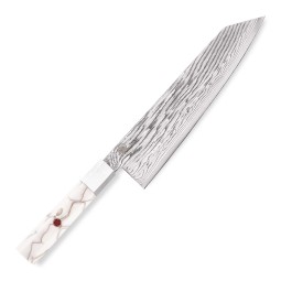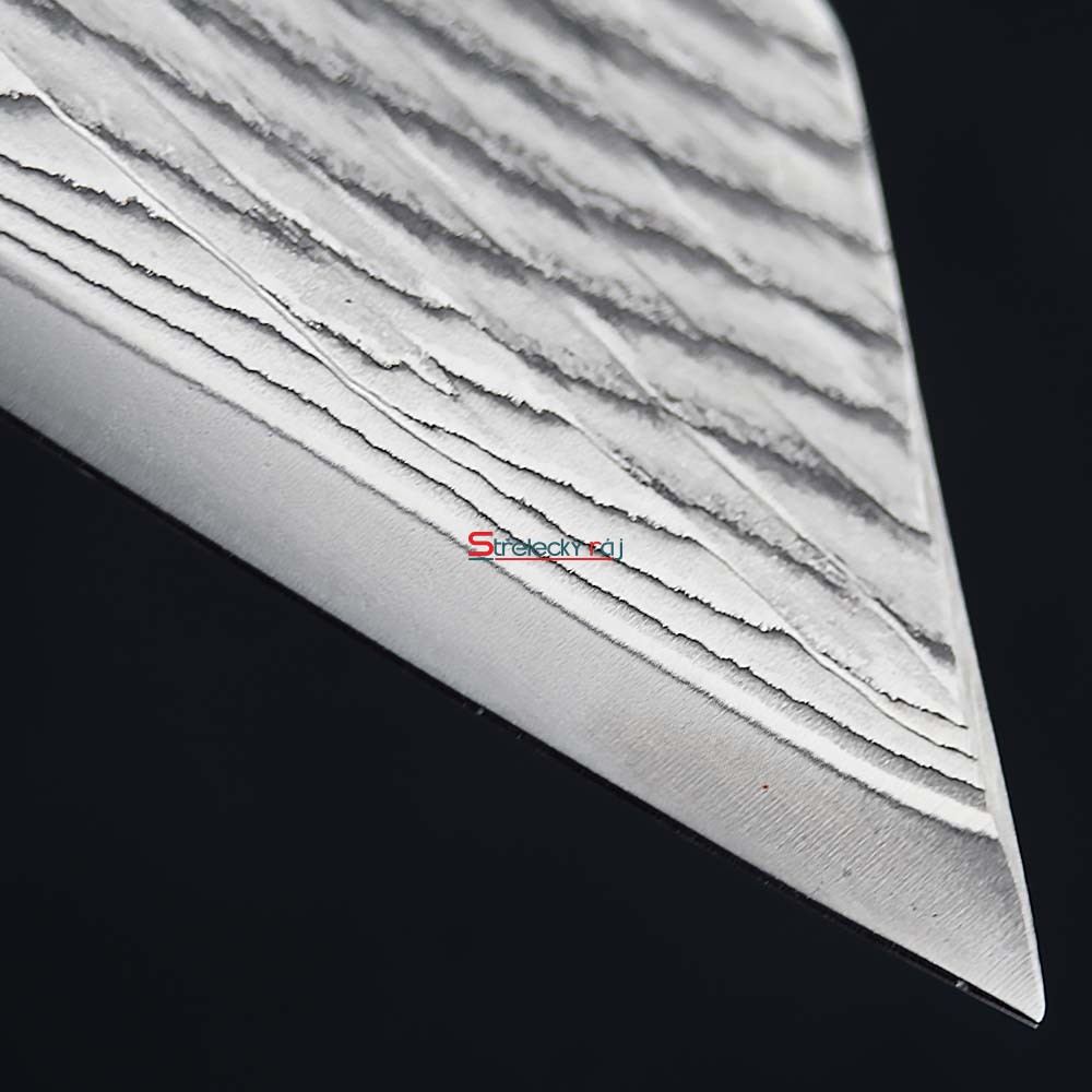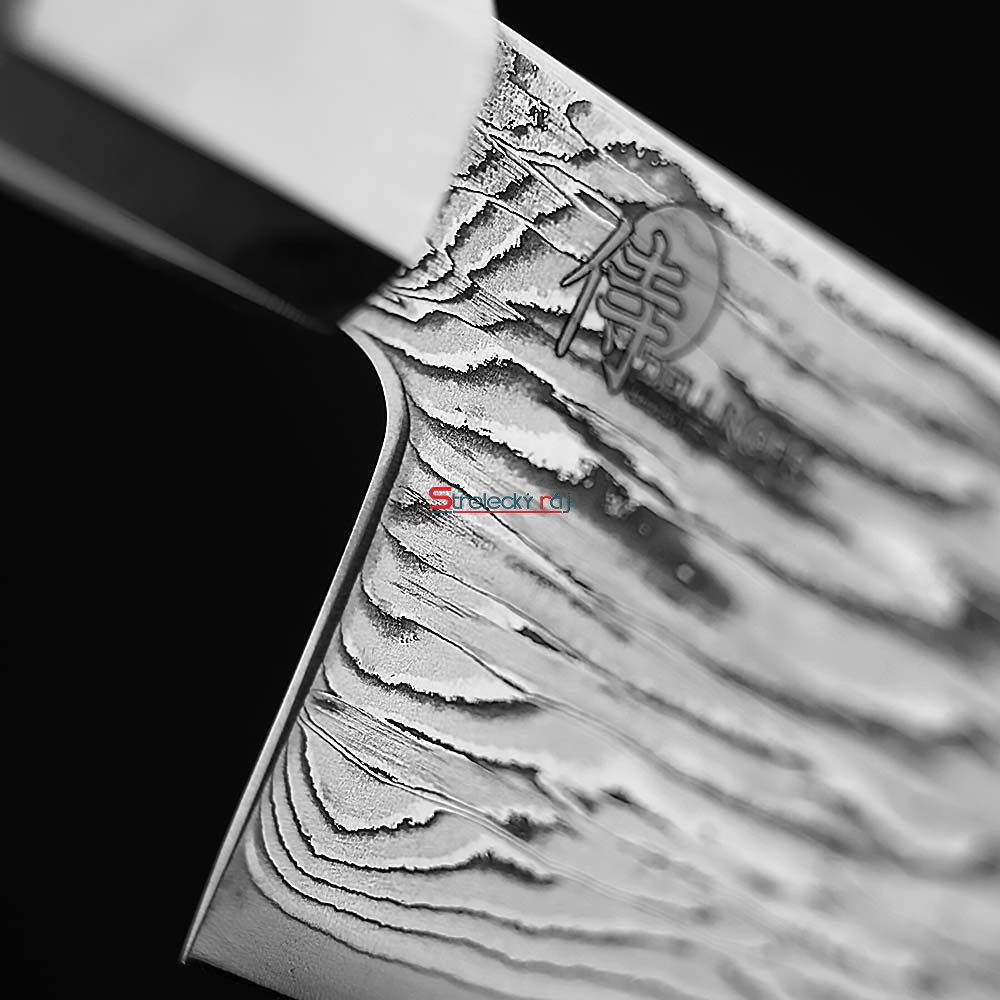 Dokonalá čepel se vzorem White WaveJádro čepele je vyrobeno z damascénské oceli s tvrdostí 61±1 HRC, obklopené 66 vrstvami dvou druhů nerezové oceli. Toto vrstvení zajišťuje maximální houževnatost a odolnost. Surový vzor ručně kovaného damašku. Neuhlazený, živý povrch s výraznou kresbou vrstev oceli odhaluje skutečný charakter řemeslné výroby a dává každému noži jedinečnou identitu. Precizní zpracování zaručuje snadnou údržbu a dlouhotrvající ostrost, kterou lze snadno obnovit broušením na vodních kamenech.
