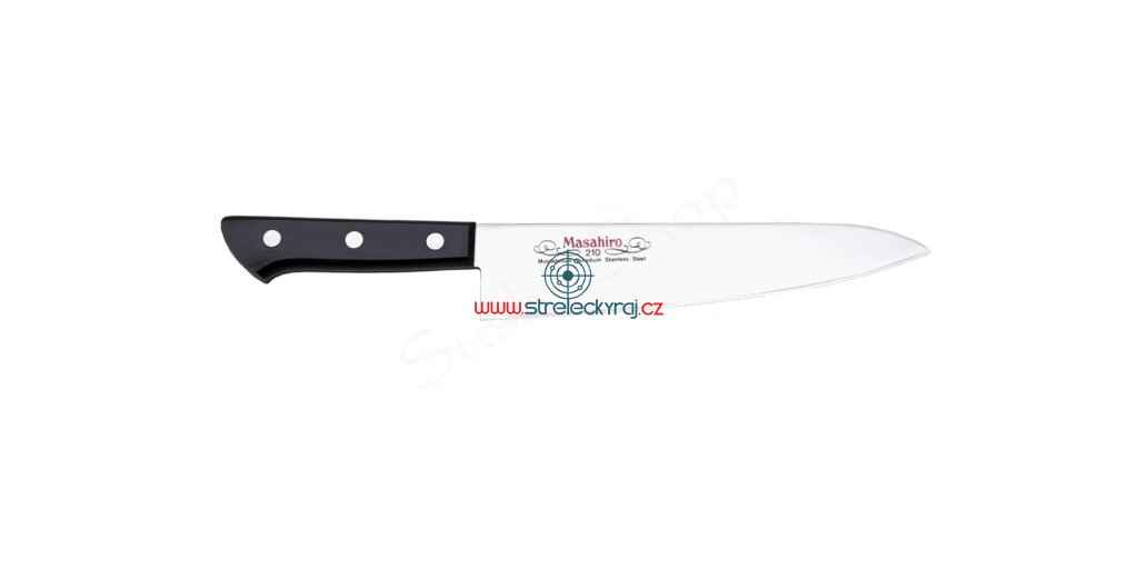 Masahiro BWH Chef o długości ostrza 210mm to jeden z najczęściej wybieranych noży do kuchni, zarówno przez profesjonalnych kucharzy jak i amatorów. Charakterystyczny kształt noża, wywodzący się z kuchni francuskiej wykorzystywany jest do wielu zadań kuchennych a nazwa nóż szefa kuchni, podkreśla fakt, że jest to nieodzowne narzędzie każdego kucharza. Nóż jest bardzo lekki a rękojeść pewnie leży zarówno w małych jak i dużych dłoniach. Dzięki idealnemu wyważeniu pomiędzy ostrzem a rączką pozwala na rytmiczny, bardzo wydajny, kołyszący ruch na powierzchni podczas krojenia w plastry lub siekania różnych produktów.BWH to seria noży wykonana na wzór linii MV-H. Zastosowano tu również molibdenowo-wanadową, wysokowęglową, nierdzewną stal MBS-26, która została poddana trójstopniowemu procesowi hartowania aż do osiągnięcia twardości 58-59 HRC. Każde ostrze zostało doprowadzone do perfekcji przez rzemieślników z ponad 30 letnim doświadczeniem, wynosząc noże Masahiro do poziomu niebywałej, niespotykanej ostrości.Rękojeść została wykonana z drewna o nazwie Black Pakkawood, którego liczne warstwy zostały pod dużym ciśnieniem i w wysokiej temperaturze sprasowane w jednolity, bardzo trwały, odporny na wilgoć i wodę materiał. Drewniany uchwyt z powłoką antybakteryjną jest łatwy w pielęgnacji niczym plastik, został zabezpieczony trzema perfekcyjnie osadzonymi i wypolerowanymi nitami.Noże z tej serii są ostrzone z dwóch stron lecz w przeciwieństwie do większości zachodnich producentów, Masahiro ostrzy je asymetrycznie 80/20. Oznacza to, że krawędź tnąca przesunięta jest na jedną ze stron w osi noża. Korzyści z zastosowania asymetrycznego ostrzenia to nawet o 35% w stosunku do symetrycznego ostrza cieńsza krawędź tnąca, przez co znacznie ostrzejsza.