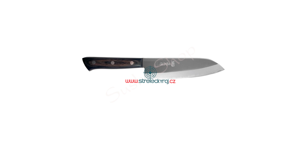Nóż Masahiro NEO Santoku o długości ostrza 165 mm posiada charakterystyczny kształt dla noży kuchni japońskiej (obniżony czubek w porównaniu do typowego europejskiego noża Szefa kuchni). Taka budowa pozwala na wykorzystywanie go jako odpowiednik zachodniego noża szefa. W swobodnym tłumaczeniu z języka japońskiego nazwa tego bardzo popularnego noża oznacza "trzy zalety" czy też "trzy cnoty". Nawiązuje to do faktu, iż nóż ten, którego charakterystyczny wygląd przypominający połączenie noża szefa kuchni z tasakiem bardzo dobrze nadaje się do krojenia mięsa, ryb i warzyw.Linia Masahiro NEO łączy najlepszej jakości stal z tradycyjną europejską rękojeścią. Jest to nie lada gratka dla wszystkich oczekujących perfekcyjnej ostrości, japońskiego designu ostrza i tradycyjnego europejskiego uchwytu. Do produkcji tej serii została wykorzystana jedna z najlepszych stali, czyli stal proszkową *Super Gold 2. Ostrza noży Masahiro NEO zakuwane są z 3 warstw stali, gdzie rdzeń to stal SG2 a zewnętrzna miękka warstwa to stal SUS410L. Dzięki takiemu wykonaniu na klindze tworzy się charakterystyczna linia zwana Katana-Edge. Zdobienie to pochodzi z tradycyjnego wyrobu mieczy japońskich. Z czasem linia ostrza może stać się trochę ciemniejsza co dodatkowo uwypukli dalekowschodni charakter noża. Rękojeść noży wykonana jest z laminowanego drewna o przepięknym czarnym usłojeniu. Jest to drewno impregnowane żywicą, która świetnie zabezpiecza przed wilgocią. Uchwyt noża jest przymocowany do trzpienia za pomocą trzech nitów. Świetnie wyprofilowany kształt rękojeści jest ergonomiczny i wygodnie układa się w dłoni.Noże są ostrzone w sposób asymetryczny 80/20. Oznacza to, że krawędź tnąca przesunięta jest na jedną ze stron w osi noża. Korzyści z zastosowania asymetrycznego ostrzenia to nawet o 35% w stosunku do symetrycznego ostrza cieńsza krawędź tnąca, przez co znacznie ostrzejsza. * Stal proszkowa SG2 (Super Gold #2) o wysokiej zawartości chromu (do 16%) posiada świetną odporność na korozję. Powstaje ona w wyniku skomplikowanego procesu, w którym superdrobne nanocząstki stali są scalane razem, podgrzewane i formowane w pożądany kształt. Jest to metoda wytwórcza kompletnie odmienna od „tradycyjnego” wytopu i pozwala uzyskać stal o dużo lepszych parametrach użytkowych. Duża zawartość węgla (do 1,45%) pozwala zahartować nóż do wysokiej twardości dając ponadprzeciętną odporność na tępienie.
