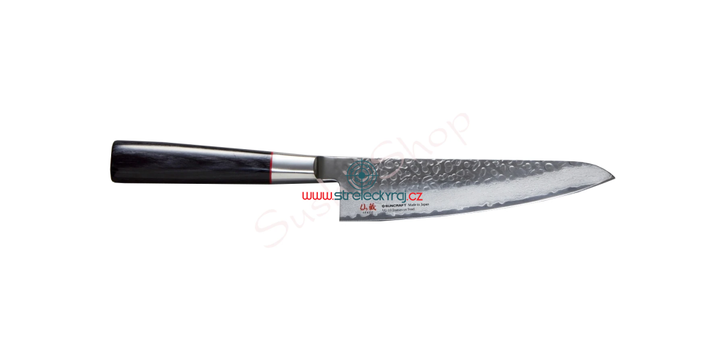 Nóż kuchenny Suncraft SENZO CLASSIC Santoku small 143 mmSantoku to japoński brat zachodniego noża szefa kuchni. Jego nazwę tłumaczy się jako „trzy zalety”, ewentualnie „trzy cnoty”. Nie bez powodu – nóż ten, z wyglądu stanowiący skrzyżowanie typowego noża szefa kuchni z tasakiem, jest wielofunkcyjny. Sprawdzi się podczas krojenia mięsa, ryb i warzyw.Bogata w produkty linia SENZO CLASSIC łączy w sobie najlepsze cechy wschodniej i zachodniej filozofii wytwórstwa noży. Zachodnie w większości są kształty i przeznaczenie noży, wschodnie z kolei są rzemiosło i design. W serii znajdują się noże o odmiennych ostrzach i zróżnicowanej wadze, czego wymaga się od narzędzi kuchennych w kręgu kultury zachodniej. Prosty, ale wyrafinowany design linii SENZO CLASSIC pozostaje w duchu japoński.Ostrza noży SENZO CLASSIC wykonuje się z 33-warstwowej nierdzewnej tzw. stali damasceńskiej* wzmocnionej rdzeniem ze stali VG-10**. Kompozycja ta jest niezwykle trwała, a samo ostrze odporne na proces niszczenia i tępienia. Na zbliżeniu widać delikatny, falowany wzór, który przywodzi na myśl miecze samurajskie.Noże SENZO CLASSIC cechuje bardzo wyrafinowana konstrukcja. Na powierzchni uchwytu wykonanego z tzw. Pakkawood*** w kolorze czarnym nie ma nitów, co czyni je niezwykle eleganckim. Czerwony pierścień u nasady ostrza przyciąga wzrok, a młotkowanie ostrza „Tsuchime” nie tylko efektownie wygląda – sprawia również, iż krojone produkty nie przywierają do noża i łatwo ześlizgują się z ostrza.*Stal damasceńska – współczesna tzw. stal damasceńska składa się z nałożonych na siebie kolejnych, niezwykle cienkich arkuszy stali nierdzewnej, z czego 25% środkowych arkuszy zwanych jest rdzeniem, zaś na pozostałe 75% składają się arkusze o różnej twardości – naprzemiennie nakładanej stali miękkiej i twardej. W efekcie na powierzchni noża powstaje efekt „falowania”.**Stal VG-10 ten rodzaj stali uznany został za jeden z najlepszych do produkcji noży kuchennych. Kucharze doceniają zarówno piękny design noży wykonanych z VG-10, jak i ich wyjątkową trwałość. VG-10 to materiał o dużej twardości, na skali HRC otrzymał wartość HRC 60. Dzięki temu wyprodukowane z niego noże są nieprawdopodobnie ostre oraz bardzo odporne na ścieranie.***Pakkawood to laminowane drewno brzozowe lub klonowe, impregnowane żywicą. Cechuje je bardzo duża odporność na ciepło i wilgoć, zostało opracowane specjalnie do rękojeści noży.