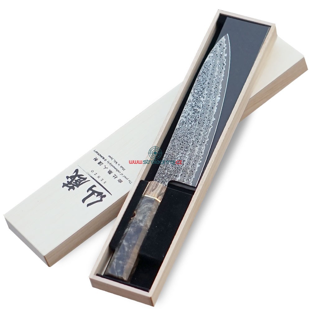 Nůž šéfkuchaře Chef / GYUTO je ideální pro všestranné využití. Díky tomu, že se hřbet nože a ostří zužují do špičky, má ideální tvar pro každý druh krájení. Je vhodný pro porcování masa, krájení ryb, plátkování, čištění masa a ryb, ovoce a zeleniny. Výše položený hrot Vám umožní i kolébkové krájení bylinek nebo ořechů.