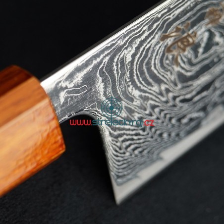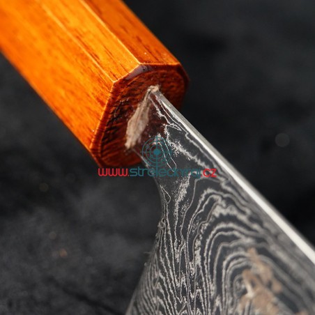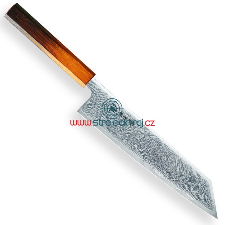 Japonský extrémně ostrý nůž Kiritsuke z damaškové oceli s působivým designem a nejvyšší kvalitou. Nůž Kiritsuke je specifický japonský nůž, který je považován za jedinečný a ceněný pro svou všestrannost a elegantní design. Kiritsuke je tradiční nůž, který je původně používán ve výhradě japonskými šéfkuchaři nebo mistry sushi. Jedna z hlavních charakteristik nože Kiritsuke je jeho jedinečný tvar. Má dlouhou, rovnou čepel s asymetrickým profilem, který kombinuje vlastnosti nože Yanagiba (japonského rybářského nože) a Usuba (japonského zeleninového nože) do jednoho nože. Na jedné straně ostří je delší s konvexním tvarem, což je ideální pro rybí maso, zatímco na druhé straně ostří je kratší s konkávním tvarem, což je vhodné pro práci s zeleninou. Tento asymetrický tvar umožňuje šéfkuchaři provádět různé úkoly s jedním nožem. Nůž Kiritsuke je oblíbeným nástrojem mezi šéfkuchaři díky jeho všestrannosti. Je vhodný pro krájení, plátkování, drcení, dělení a další kuchyňské úkoly. Je ideální pro práci s různými druhy masa, ryb, zeleniny a ovoce. Ostří nože Kiritsuke je obvykle velmi ostré a tenké, což umožňuje precizní řezy a dosahování profesionálních výsledků. Celkově je nůž Kiritsuke ceněn pro svou univerzálnost a schopnost dosáhnout vynikajících výsledků při přípravě sushi, sashimi a jiných japonských pokrmů. Je to vynikající nástroj pro profesionální kuchaře i vášnivé kuchaře doma, kteří oceňují kvalitu a tradiční řemeslné zpracování japonských nožů.