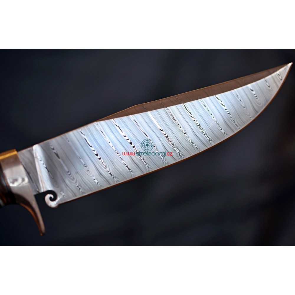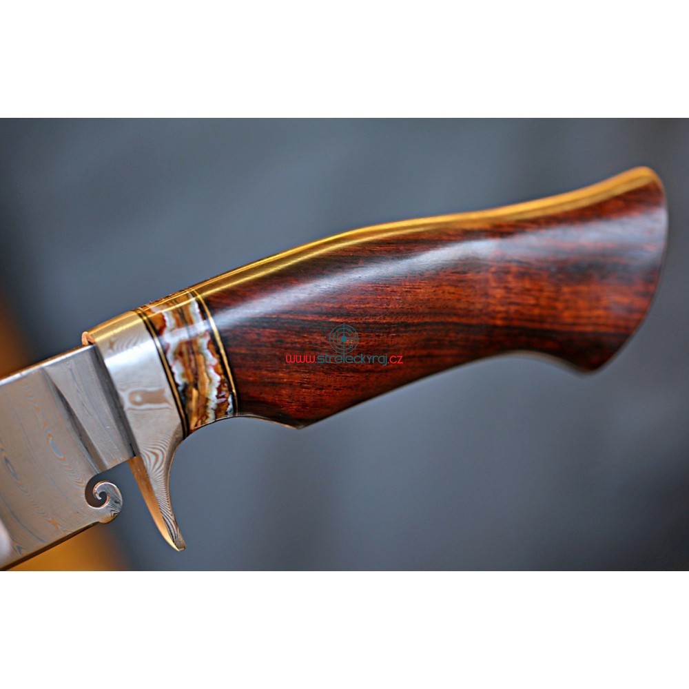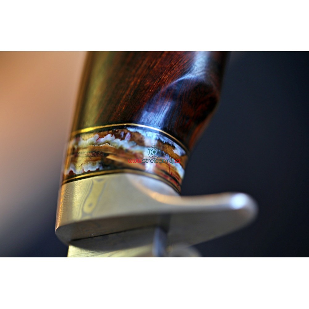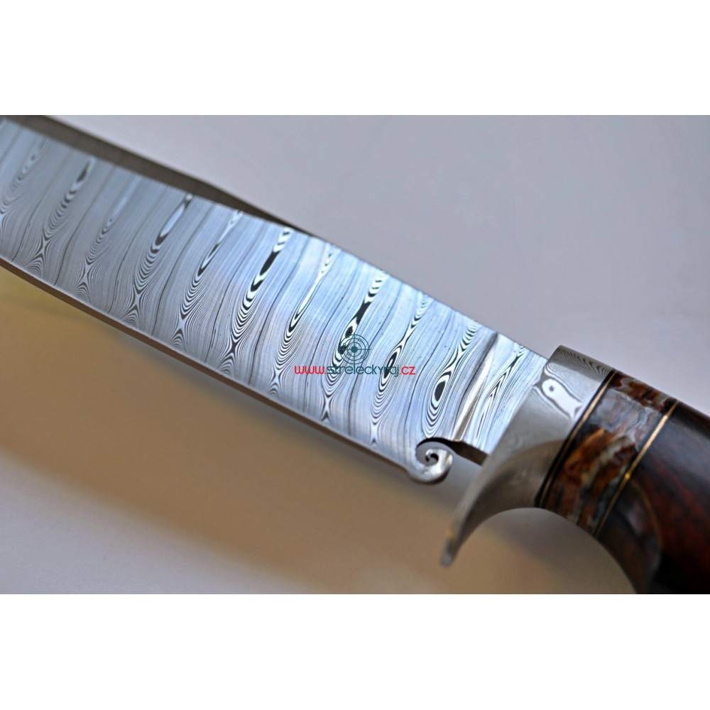 Jedinečný - velmi kvalitní, ručně vyrobený nůž s čepelí z damaškové oceli z dílny Devina Thomase http://www.devinthomas.com/ Použití této oceli zajišťuje extrémní řezné vlastnosti. Rukojeť je ručně broušena z Iron-Wood a ozdobena fosílií mamutího zubu. Lesklá, kvalitní ocel a exotické dřevo tvoří perfektní pár a konečný výsledek je naprosto uchvacující.