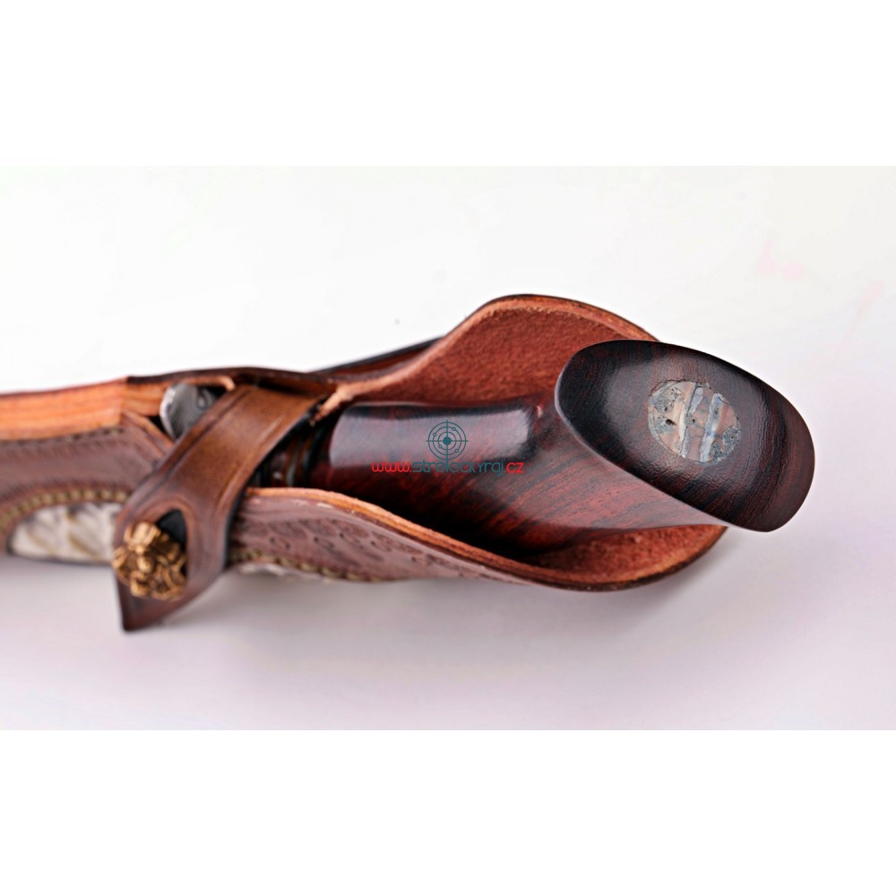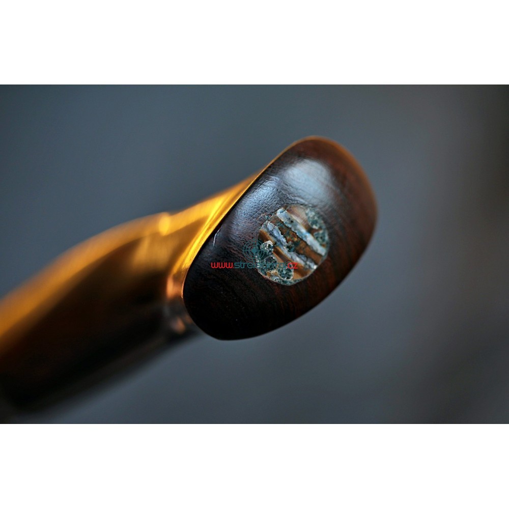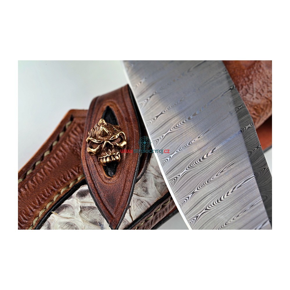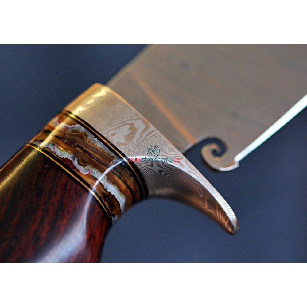 Jedinečný - velmi kvalitní, ručně vyrobený nůž s čepelí z damaškové oceli z dílny Devina Thomase http://www.devinthomas.com/ Použití této oceli zajišťuje extrémní řezné vlastnosti. Rukojeť je ručně broušena z Iron-Wood a ozdobena fosílií mamutího zubu. Lesklá, kvalitní ocel a exotické dřevo tvoří perfektní pár a konečný výsledek je naprosto uchvacující.