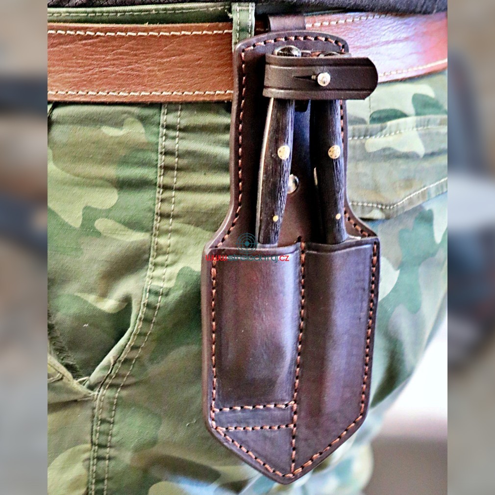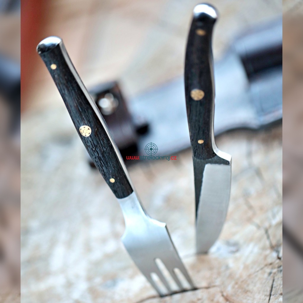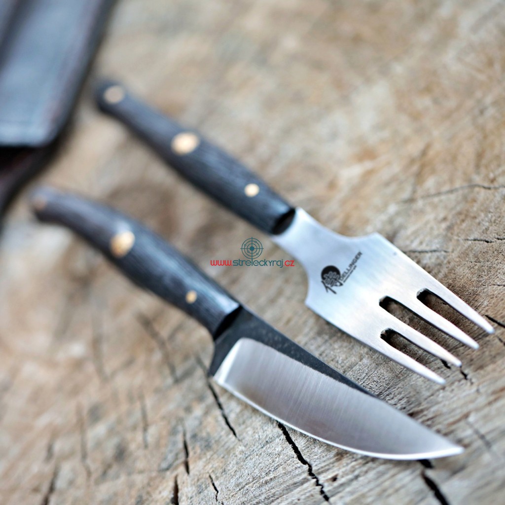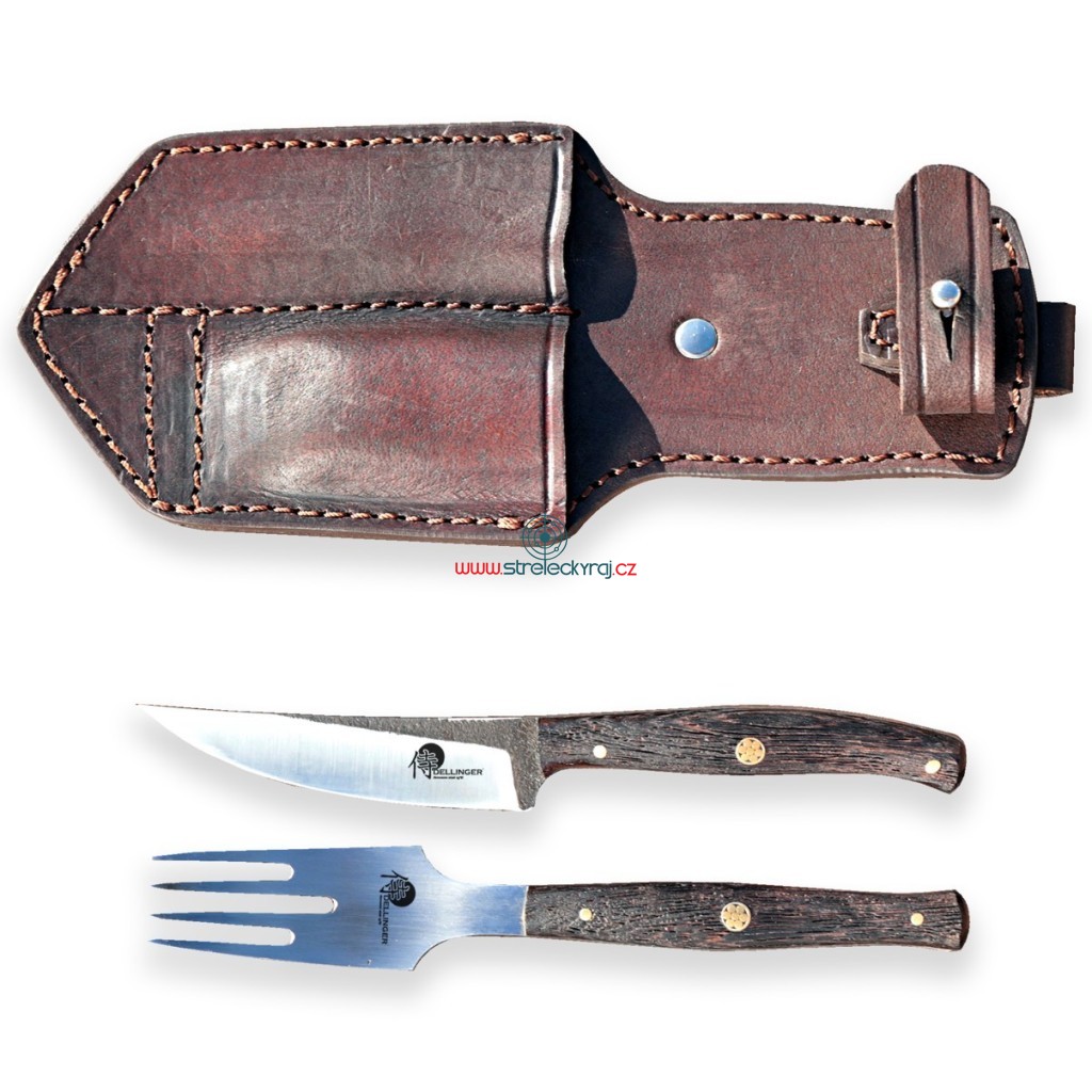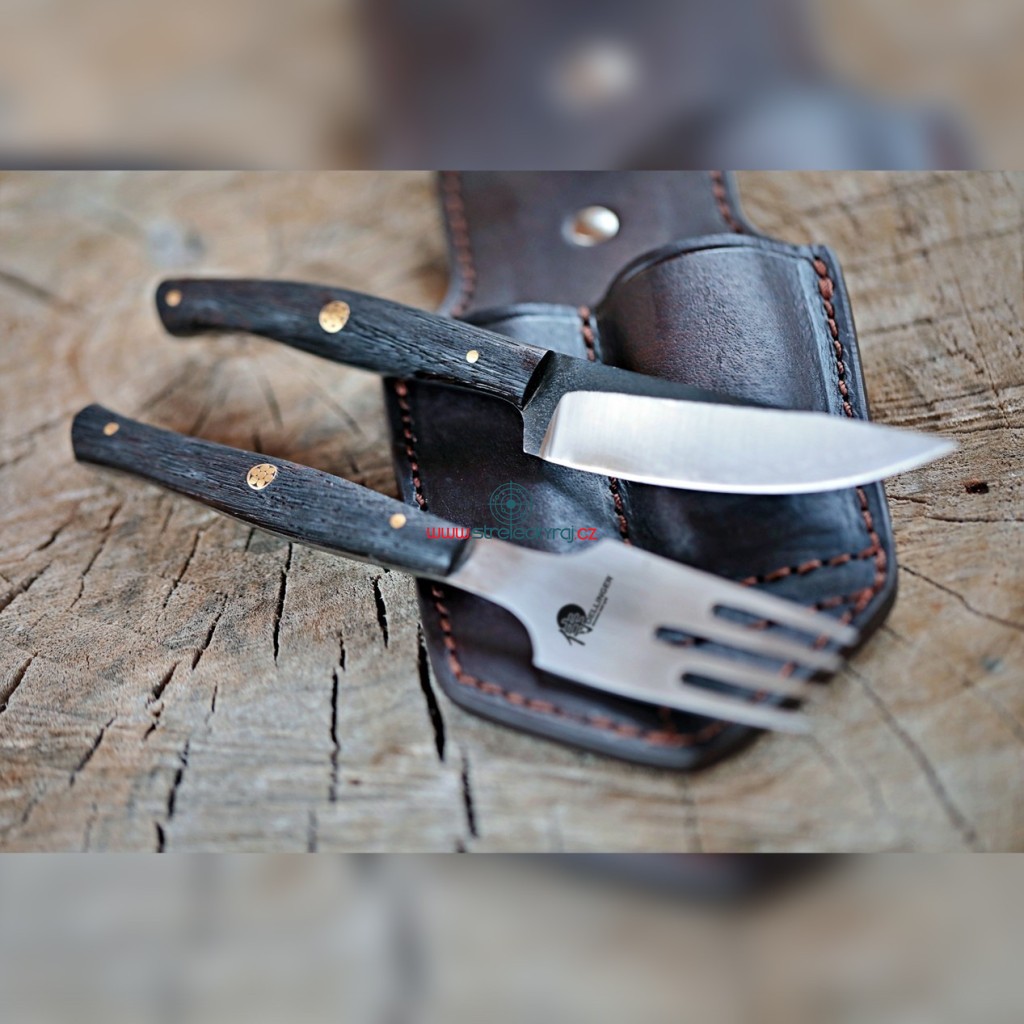 Váši velmi ostří společníci na cesty z oceli D2 s koženým pouzdrem. Tato nevšední a jedinečná sada příborů Vám bude dělat společníka nejen při BBQ - grilování, přípravě pečeného masa, žeber a hamburgerů. Hodí se na cesty a připnutá za opasek bude stále s Vámi. Tyto příbory nejen na grilování Dellinger Retter Vám usnadní jak přípravu, tak i následnou konzumaci. Patříte-li k lidem u kterých je gril a grilování oblíbená činnost - tento příbor v koženém pouzdře je prostě to co musíte mít !