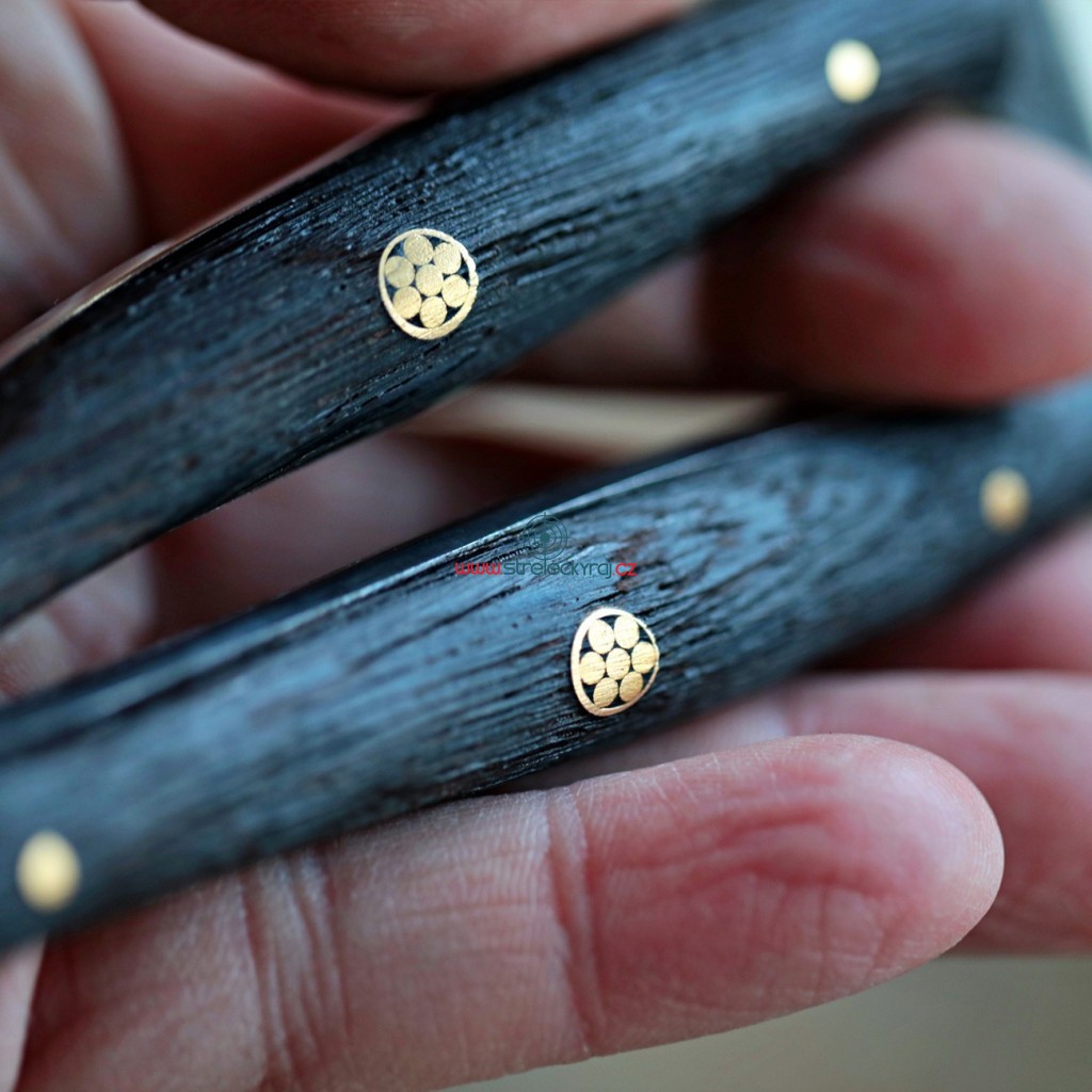 Rukojeti této příborové sady Dellinger Retter je ručně tvarována z kusu afrického tvrdého dřeva Wenge, které je olejováno Tungovým olejem a voskováno včelím voskem. Rukojeť je ozdobena středovým okrasným nýtem, který je skrz.