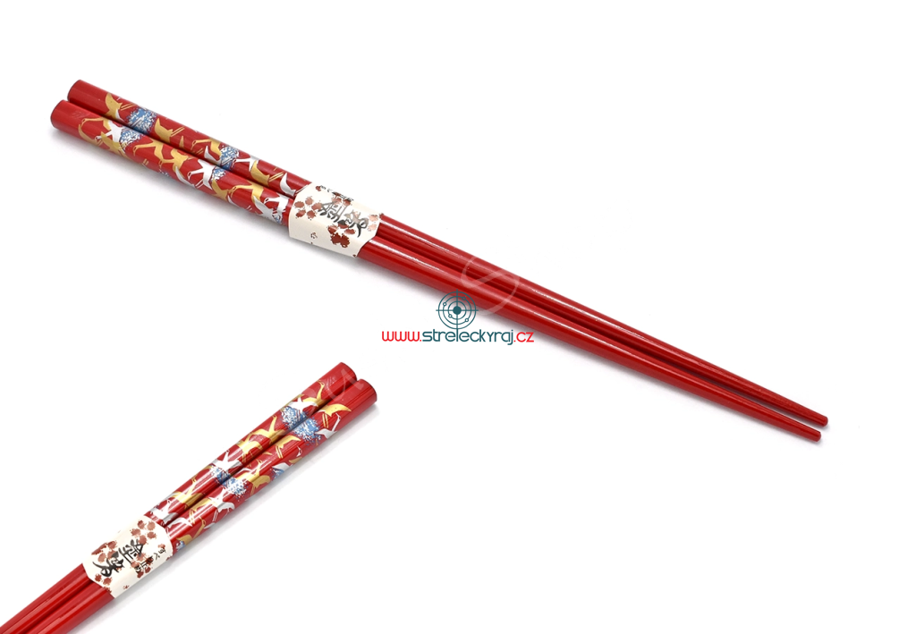 Elegantní dřevěné jídelní hůlky v sytě červené barvě zdobí motiv tancho – japonského jeřába, který je symbolem štěstí, dlouhověkosti a harmonie. Jeřáb v kombinaci se zlatými vlnkami vytváří tradiční a přitom velmi stylový design, který potěší každého milovníka japonské estetiky.