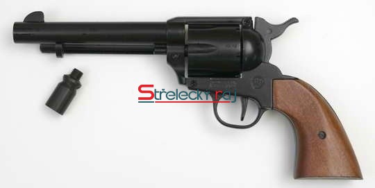 Revolver má rám vyrobený ze slitiny kovů a je dostupný ve variantách s povrchovou úpravou matné černé nebo lesklého chromu — včetně dřevěných nebo imitace dřevěných střen- kok na rukojeti, což dodává vzhledu zbraně autentický retro charakter.Kapacita bubínku je 6 nábojů (6 ran), ráže 9 mm R Blanc / 380R Blanc — což umožňuje použití startovacích nebo expanzních nábojů, poplašných i zásahových (např. CS/PV-S) v souladu s místní legislativou.Přední část hlavně je vybavena vývrtem pro našroubování nástavce pro světlice (15 mm), takže zbraň lze snadno přizpůsobit pro startování, signální použití nebo akce s efektem. Zařazení v ČR: kategorie C-I — zbraň je dostupná pro osoby starší 18 let, vyžaduje registraci u příslušného útvaru Policie ČR a osobní převzetí. Použití je možné na střelnicích nebo v jiném bezpečném prostoru podle zákona.Díky tomuto provedení se hodí jak pro stylové vystoupení, sběratelské účely, tak i pro aktivní použití v režimu expanzní zbraně — například pro sebeobranu v rámci právních podmínek nebo pro tréninkové a zábavné střelby.Parametry:Model / značka: Bruni Single Action Peacemaker ME RangerTyp zbraně: Plynový (expanzní) revolverRáže: 9 mm R Blanc / 380R BlancKapacita bubínku: 6 nábojůDélka zbraně: 265 mmŠířka / výška: 43 mm / 135 mmHmotnost: 980 gMateriál těla: Slitina kovů Povrchová úprava: Chrom nebo černá matná variantaObsah balení:Bruni Single Action Peacemaker černýNástavec na pyrotechnikuNávod se záručním listemKartonová krabice