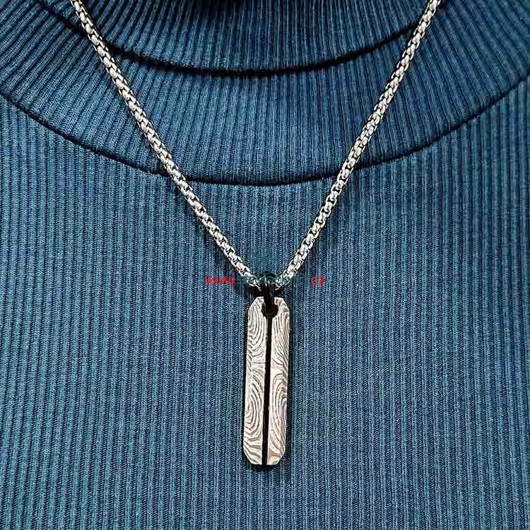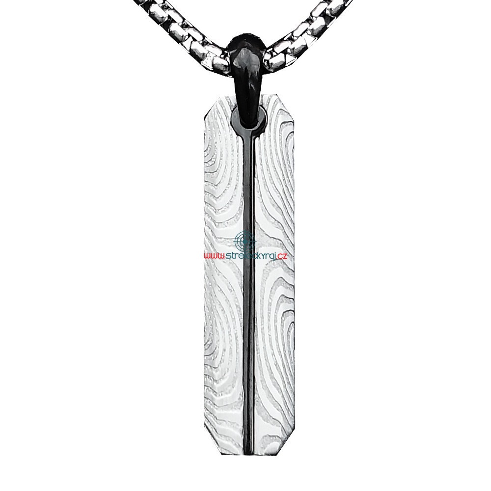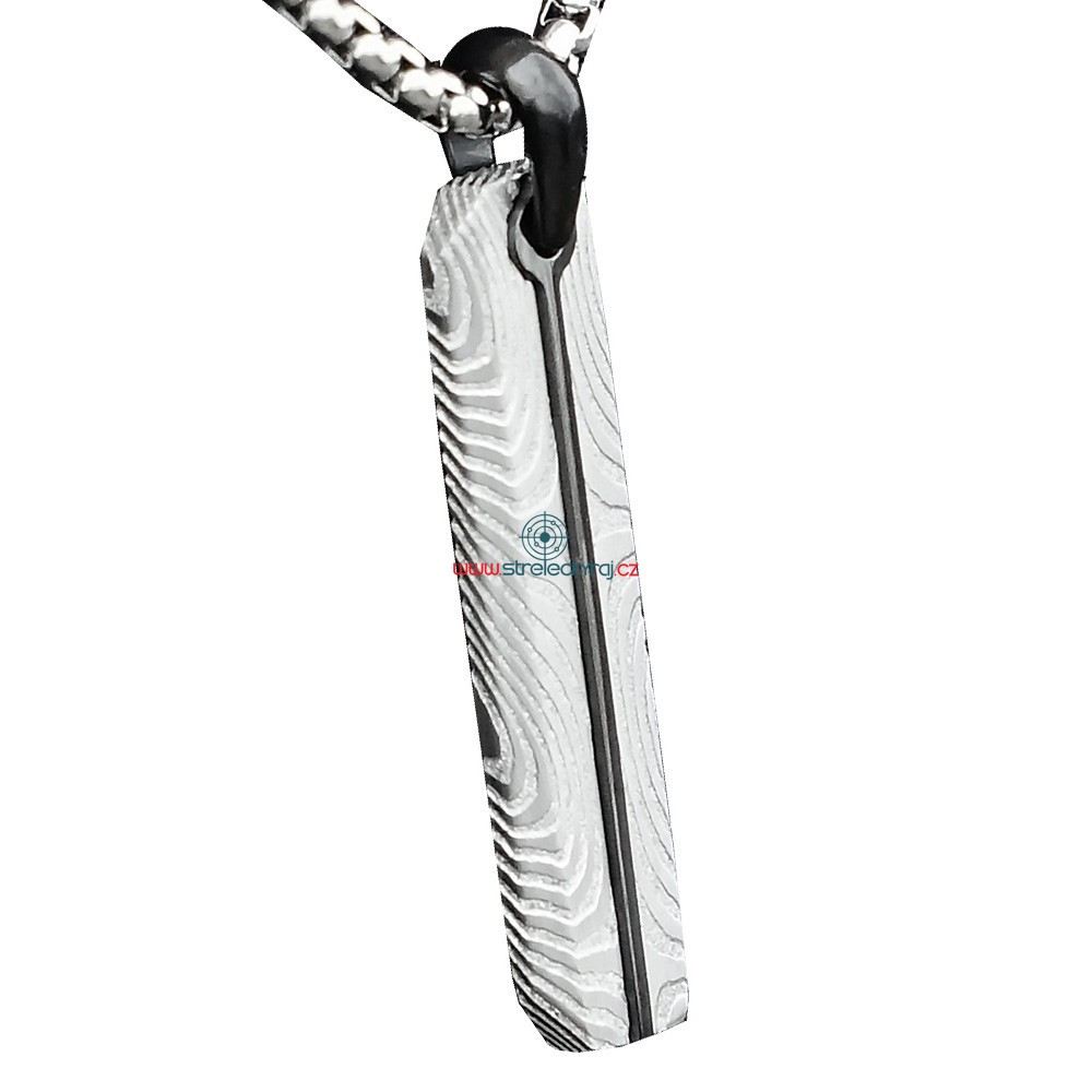 Přívěsek Spiorad představuje sofistikované spojení damaškové oceli a karbonu, což mu propůjčuje moderní a technický vzhled. Šperk má úzký, podlouhlý tvar se šestihrannými zkosenými hranami, které vytvářejí atraktivní geometrickou hru světla. Přední část přívěsku zdobí damaškový vzor s jemnými vlnitými liniemi, které vznikly precizním skládáním a kováním oceli. Tato unikátní textura činí každý kus nezaměnitelným originálem.