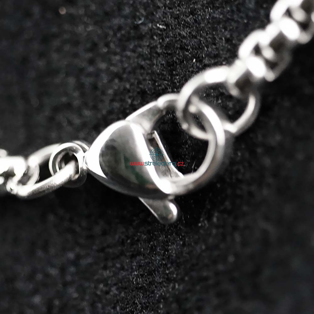 Střed šperku zdobí kontrastní karbonový pruh, který do designu vnáší dynamický prvek moderních technologií. Přívěsek je zavěšen na robustním očkovém řetízku, jehož struktura dokonale souzní s minimalistickým pojetím celého šperku. Je to odolný doplněk pro ty, kteří hledají spojení tradičních hodnot s progresivním designem.