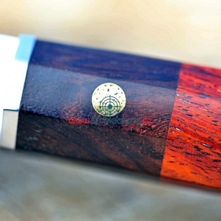 Osmihranná rukojeť (octagonal handle) je vyrobena ze stabilizovaného dřeva Palisandru a Ebenu. Je ozdobena středovým mozaikovým nýtem a vždy pečlivě ručně leštěná, ergonomicky tvarovaná. Ideálně navržena pro vynikající ruční ovládání. Speciálně navržený tvar záštity je vhodný pro asijský úchop nože.