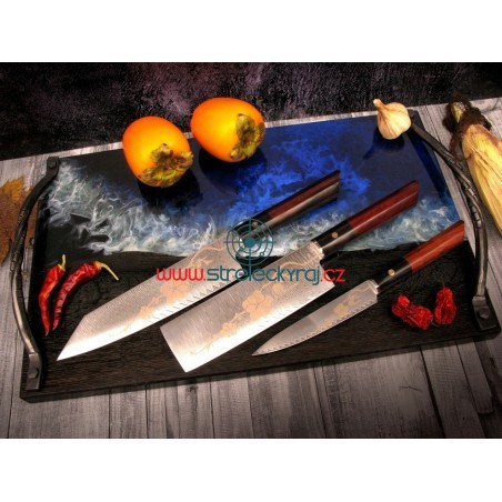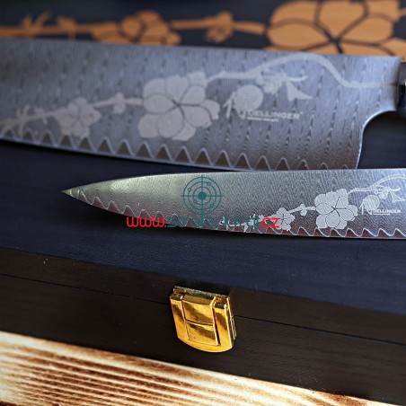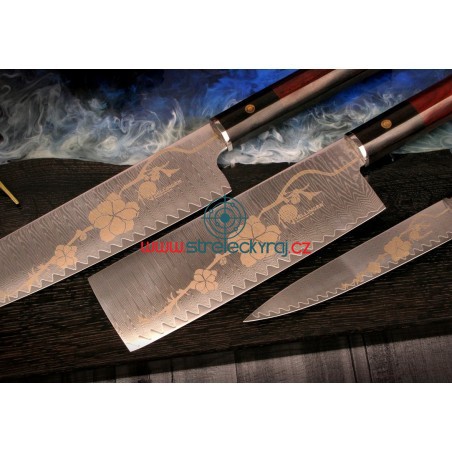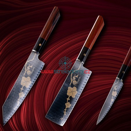 Překrásná sada 3 nožů Dellinger JOSHI Sakura z japonské damaškové oceli (damascus steel) VG-10 s působivou kresbou sakury na ostří nožů. Velmi ostré a tvrdé řezné jádro z japonské oceli vg-10, které je velmi dobře chráněno proti korozi, tím že je vloženo mezi 66 vrstev 2 nerezových damascénských ocelí SS316 (damascus steel), které zajišťují mimořádnou odolnost a houževnatost. Čepel tohoto nože prochází kalením ve velmi přesných vakuových pecích (vacuum heat treatment). Každý nůž je ručně broušený a při tvrdosti okolo 61 HRC dosahuje mimořádné až extrémní ostrosti. Sada nožů z japonské damaškové oceli s působivou kresbou, která připomíná květy slavné japonské třešně, jsou ideálním dárkem pro kohokoliv, kdo se často pohybuje v kuchyni a krájení je pro něj něco víc než jen nutné zlo.
