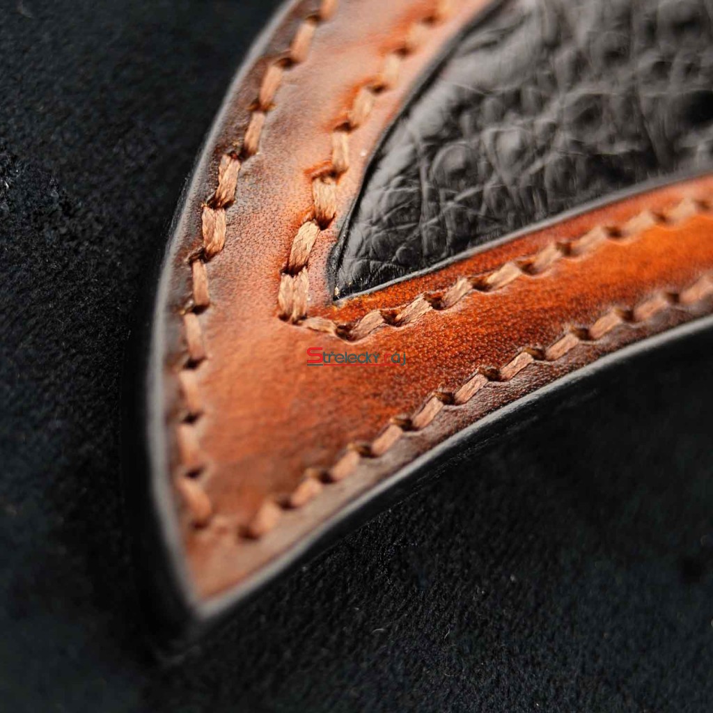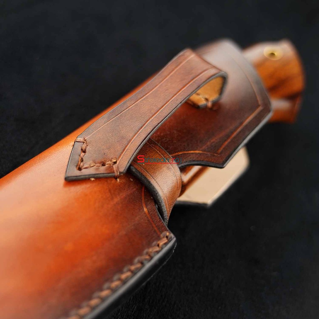 Součástí nože je ručně šité kožené pouzdro, tvarované přesně na míru. Slouží nejen k ochraně čepele, ale i jako důstojný doplněk k noži, který má být nošen, chráněn a předáván dál.