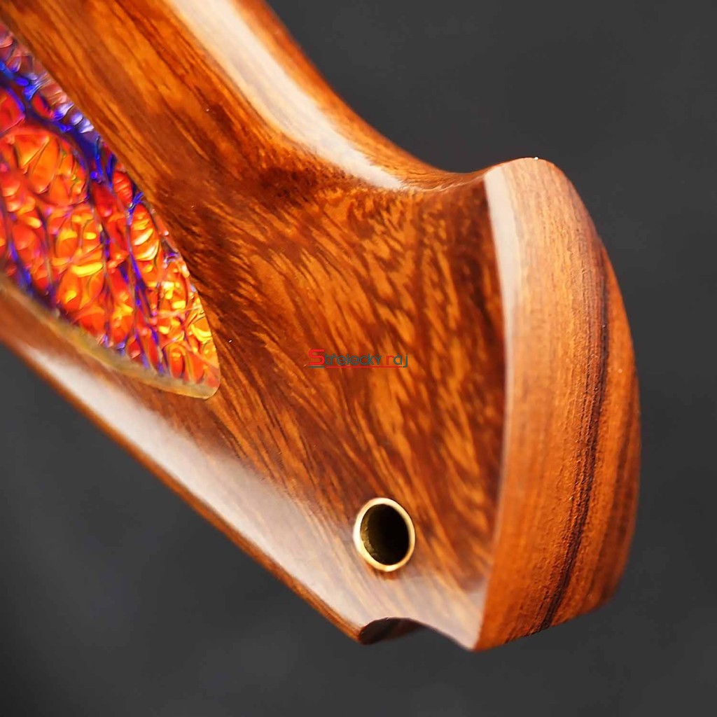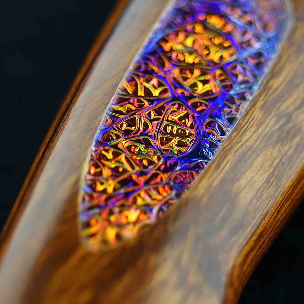 Rukojeť je vyrobena z Desert Ironwood (pouštní železné dřevo) – extrémně hustého, tvrdého a přirozeně stabilního materiálu, ceněného pro svou výjimečnou odolnost a bohatou kresbu. Ironwood je dřevo, které se časem neztrácí, ale naopak získává na hloubce a charakteru. Dominantním detailem rukojeti je dekorativní vložka ze stabilizované burlové dýhy (burl veneer sheet), jejíž struktura a barvy vytvářejí kontrastní akcent připomínající drahokam zasazený do dřeva. Ergonomický tvar rukojeti byl navržen s důrazem na přirozený úchop, jistotu a komfort při práci. Precizní slícování jednotlivých materiálů potvrzuje vysoký standard zpracování.