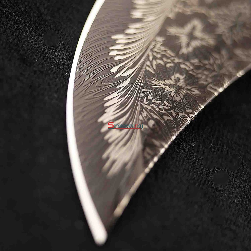 Čepel plynule navazuje na bolster z nerezové oceli SS416L, který zajišťuje pevnost, vyvážení a elegantní přechod mezi čepelí a rukojetí. Díky svým vlastnostem je tento bolster ideální pro individuální rytí motivu, ať už se jedná o ornament, symbol nebo osobní znak, čímž se z nože stává skutečně unikátní kus.