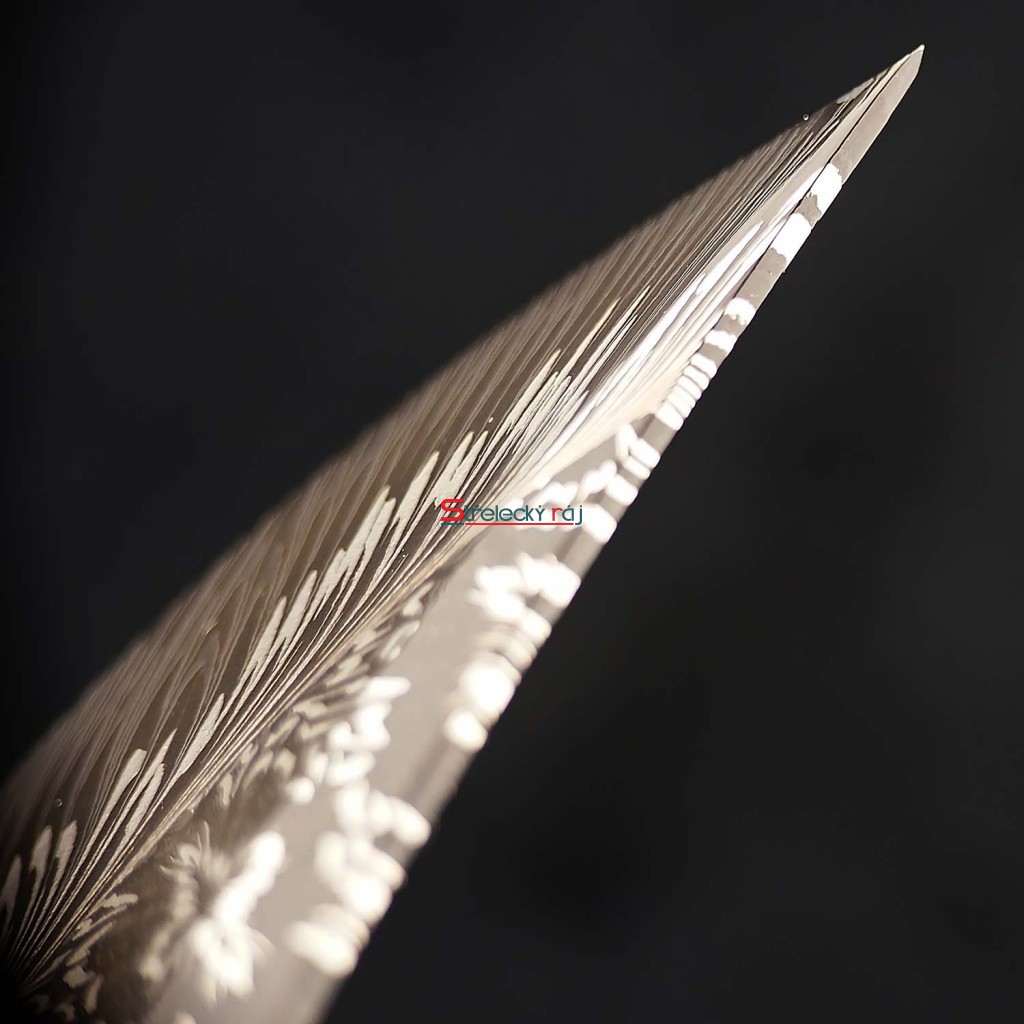 Srdcem nože je ručně kovaná čepel z mozaikového damašku Star Glow Mosaic Damascus Steel. Tento typ damašku patří mezi nejkomplexnější a nejnáročnější na výrobu – vzor vzniká skládáním a kováním ocelových segmentů do přesně definované struktury, která po leptání vytváří charakteristický „zářící“ motiv. Výsledkem je čepel s hlubokým kontrastem, jedinečným vizuálním projevem a osobitým charakterem, který nelze zaměnit s žádným jiným typem damašku.
