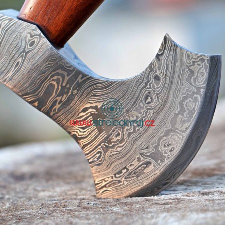Kresba vytvořená na povrchu čepeli je jedinečná a vyniká hloubkou profilu jednotlivých vrstev. Houževnatost a odolnost vůči opotřebení je samozřejmostí. Damašková uhlíková ocel není nerezová a proto vykazuje určitou citlivost na oxidaci. Pravidelná údržba, včetně olejování a udržování sucha, může pomoci minimalizovat riziko koroze. Rozsah tvrdosti je 55-60 HRC v měřítku Rockwell. Každá jednotlivá vrstva má jinou tvrdost dle typu oceli. Kožené pouzdro umožňuje snadné přenášení sekery na váš příští outdoorový výlet nebo vikingský nálet. Rukojeť (topůrko) z opáleného jasanového dřeva s pořádnou koženou omotávkou dodává luxusní a originální vzhled. Ohromující kombinace, která zaujme na první pohled. Tato praktický "bojová" sekera poskytuje spolehlivý výkon a usnadňuje širokou škálu pracovních úkolů.