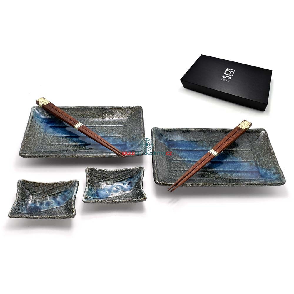 Součástí servisu jsou talířky, mističky na omáčku a hůlky. Ideální pro servírování sushi, jednoho z nejznámějších jídel japonské kuchyně.