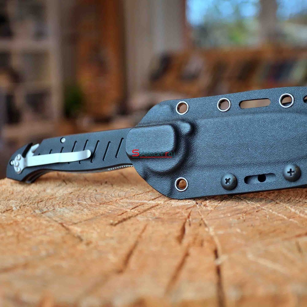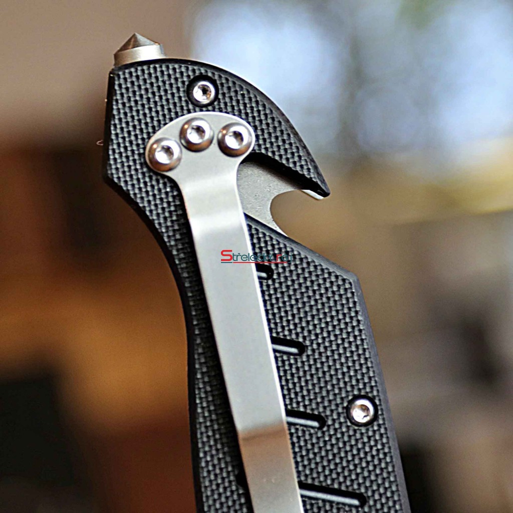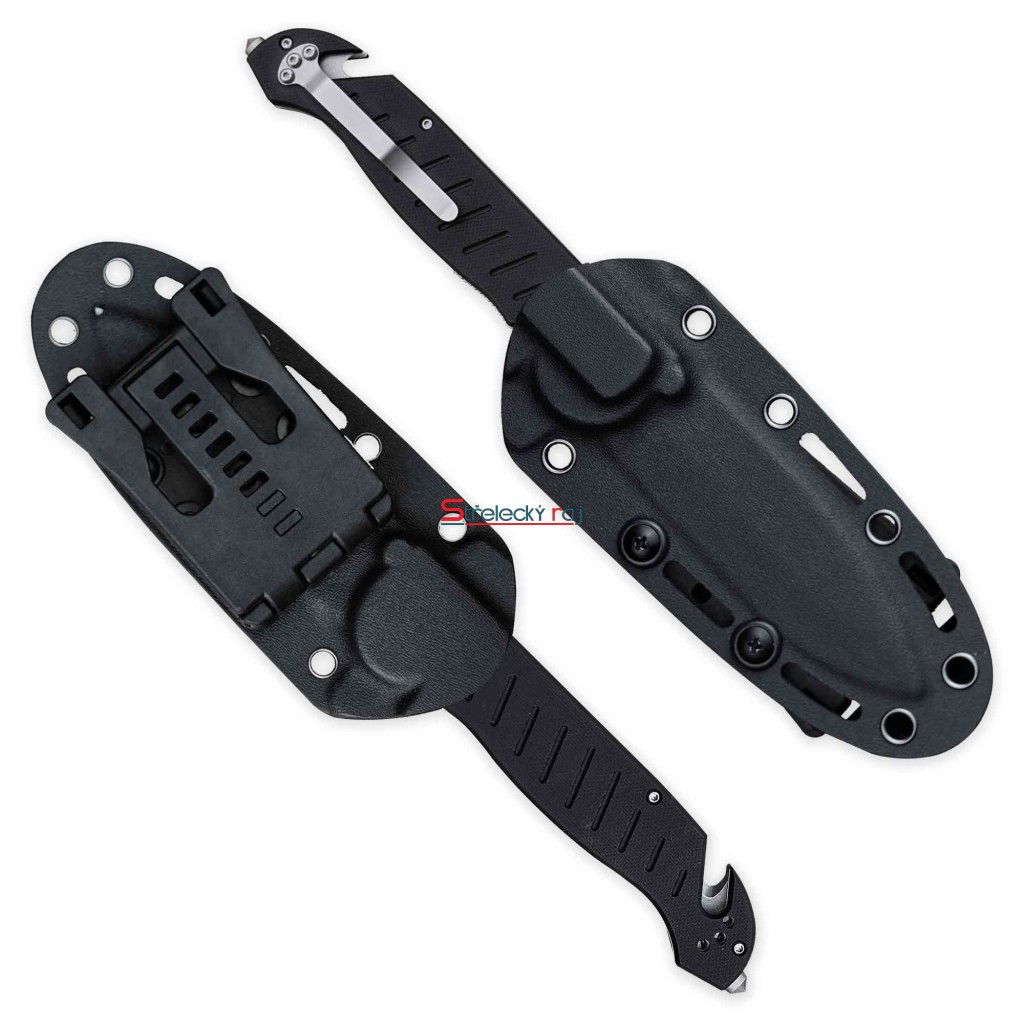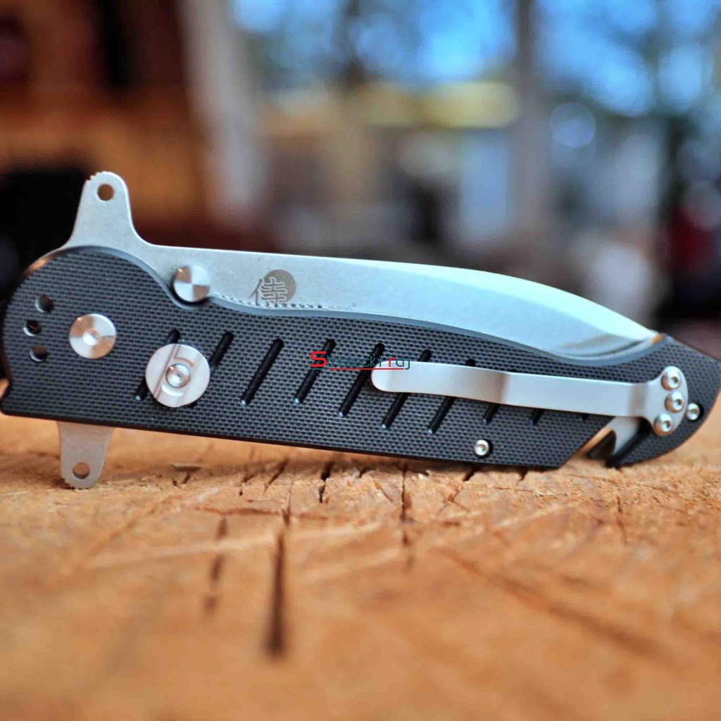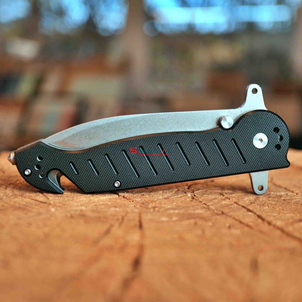 Rukojeť z černé G10 (extrémně odolný kompozit) je doplněna čtyřstranným klipem pro variabilní zavěšení, díky čemuž je nůž vhodný pro praváky i leváky. Bezpečnost zajišťuje pojistka typu Liner Lock s přídavným mechanismem proti nechtěnému zavření, což dává nástroji stabilitu srovnatelnou s noži s pevnou čepelí. Integrovaný rozbíječ skla ze slitiny wolframu a kobaltu (YG8 ALLOY) a řezač bezpečnostních pásů či provazů činí z tohoto modelu nepostradatelný záchranářský nástroj. Pohodlné jednoruční otevírání a výrazná záštita poskytují maximální jistotu úchopu a bezpečnost při práci.